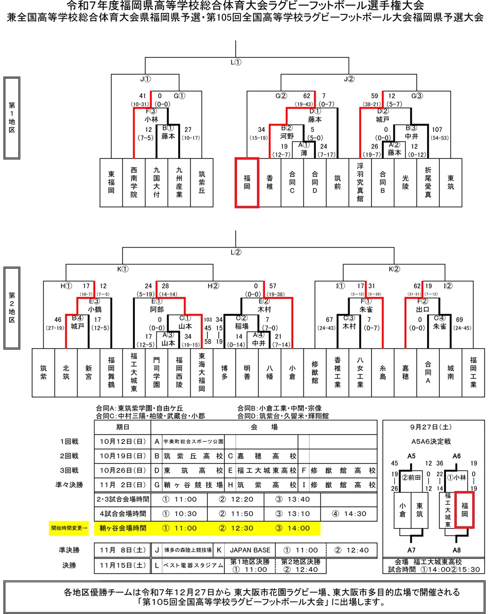 令和7年度 全国大会福岡県予選 組み合わせ 投稿者: MoriHidetoshi2025年9月10日2025年10月28日お知らせ ※11月2日(日)のキックオフ時間が12:20から12:30へ変更になりました(10/28追記) シードA5A6決定戦9月27日(土)14:00 K.O対 福工大城東福工大城東G第1地区準々決勝11月2日(日)12:30 K.O対 香椎鞘ヶ谷競技場 組み合わせの詳細はこちら — 福岡県ラグビーフットボール協会(外部サイト)