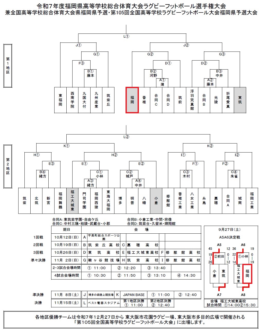令和7年度 全国大会福岡県予選 組み合わせ 投稿者: MoriHidetoshi2025年9月10日2025年9月30日お知らせ シードA5A6決定戦9月27日(土)14:00 K.O対福工大城東福工大城東G第1地区準々決勝11月2日(日)12:20 K.O対 筑前・香椎・合同C・合同Dの勝者鞘ヶ谷競技場