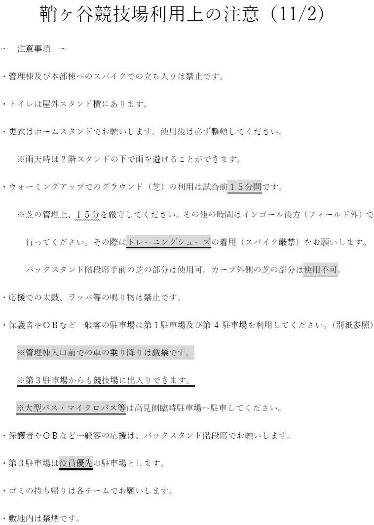 ◆管理棟入り口や競技場入り口付近での車の乗り降りは厳禁です(住民からの苦情あり)