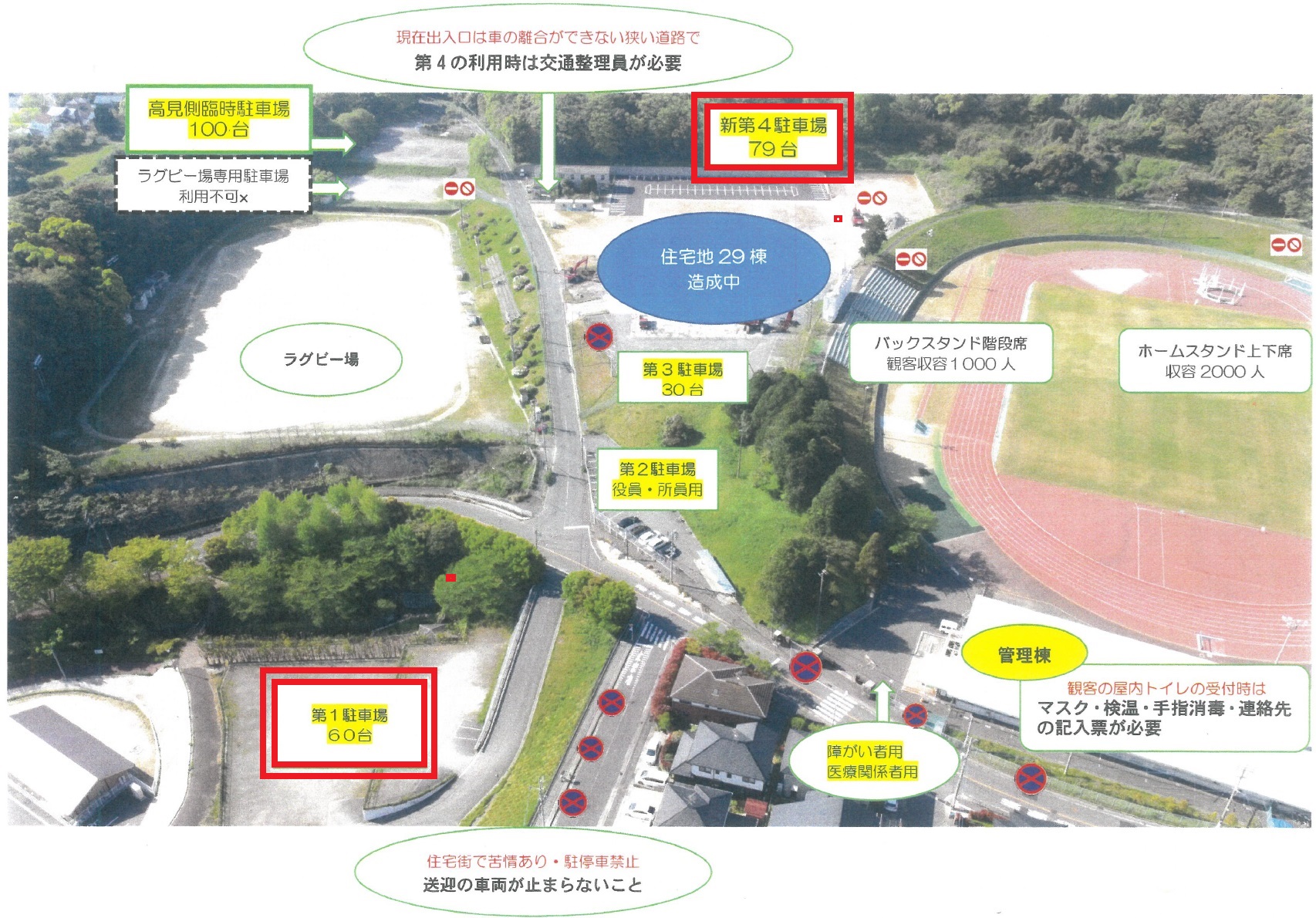 ◆OBOG、保護者等応援の皆様は、【第1駐車場】【第4駐車場】をご利用ください。駐車台数に限りがありますので、できる限りお乗り合わせの上ご来場ください。(下図参照)