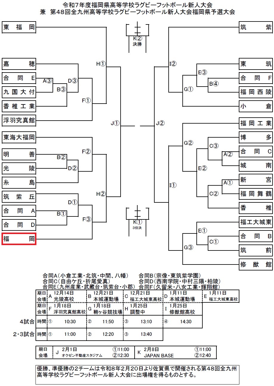 令和7年度 新人大会組み合わせ 投稿者: MoriHidetoshi2025年11月18日2025年11月18日お知らせ 3回戦1月18日(日)13:40K.O対 筑紫丘・合同A・合同Dの勝者浮羽究真館G