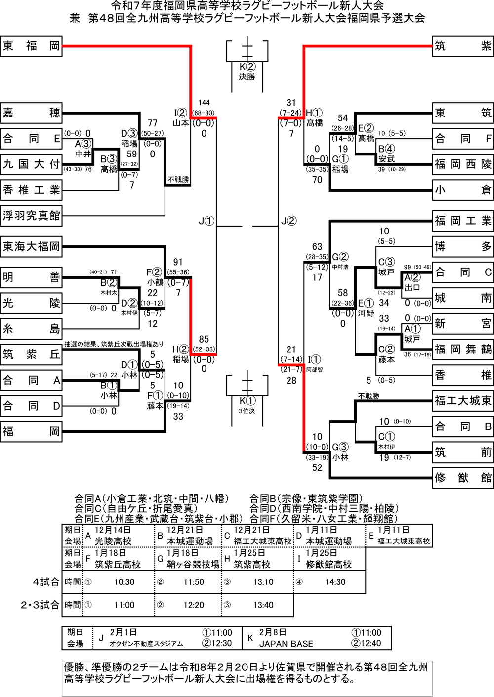 令和7年度 新人大会組み合わせ 投稿者: MoriHidetoshi2025年11月18日2026年1月26日お知らせ 初戦1月18日(日)11:00K.O対 筑紫丘筑紫丘高校G準々決勝1月25日(日)12:20K.O対 東海大福岡筑紫高校G 大会詳細はこちらをご覧ください 令和7年度福岡県高等学校新人大会 兼 第48回全九州高等学校新人大会福岡県予選大会 — 福岡県ラグビーフットボール協会(外部サイト)